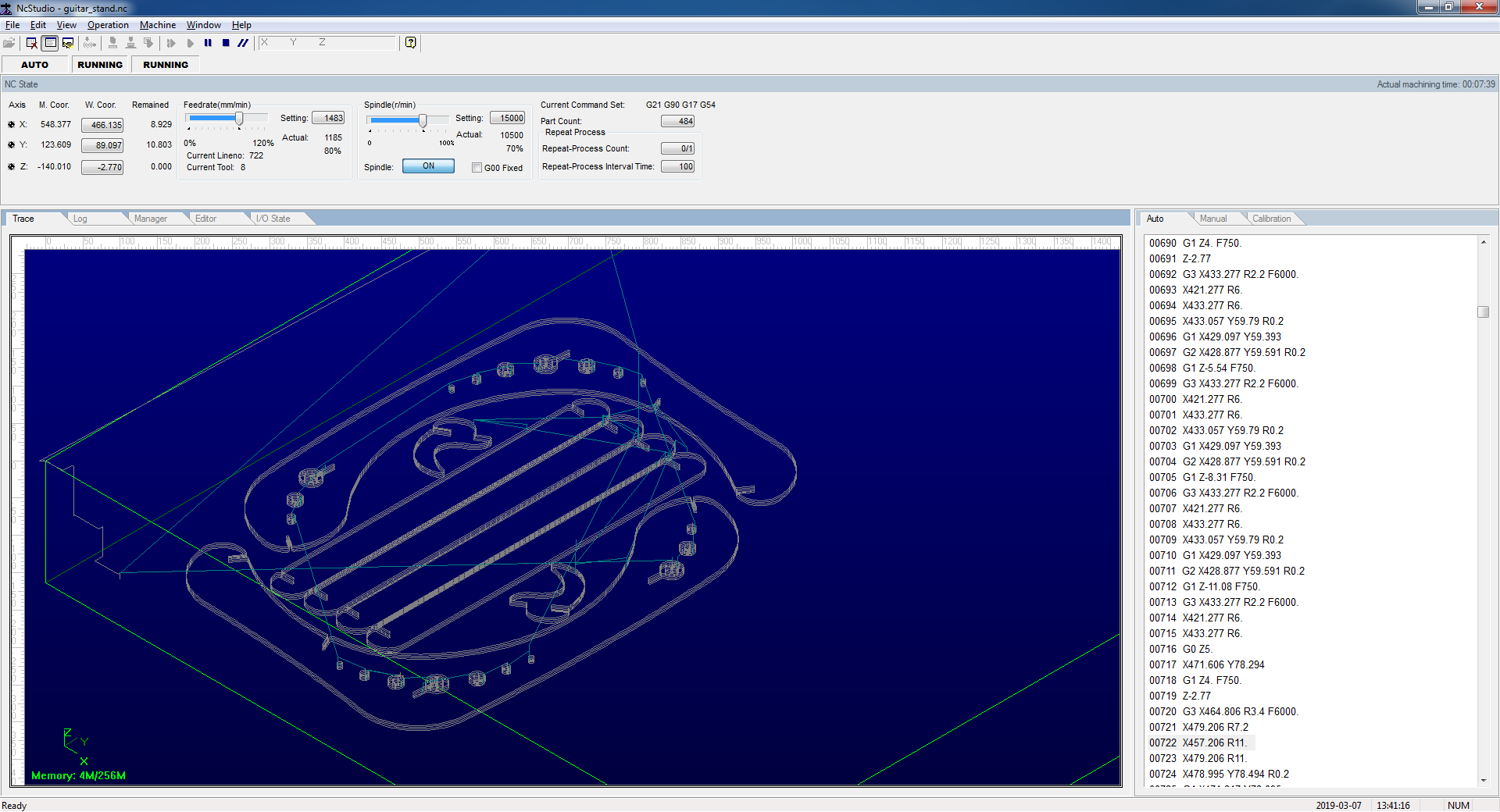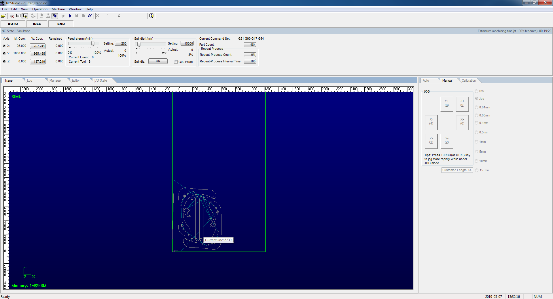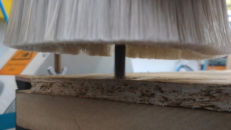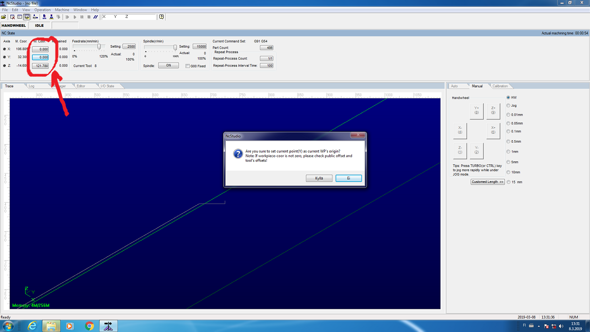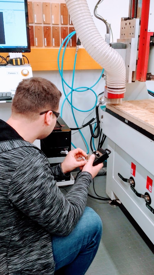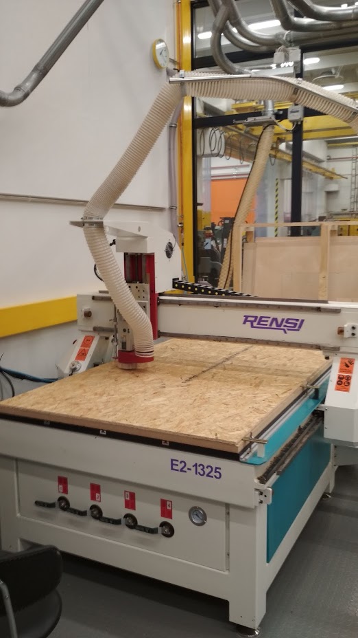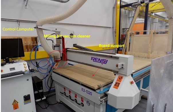 We opened the design file that supports CMC machine (NC file). We connected the flat milling bit of size 8 mm, the feed rate was 80% of the maximum 6000 mm/min to 4800 mm/min. Spindle speed is 80% of the maximum 15000 rpm-12000 rpm. We chose the board for cutting and fixed it on the table with screws. We set the Z origin both manually and automatic to the learn the process. XY position was set to zero avoiding screw region.