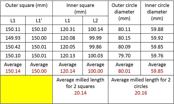 We easured the average milling length for 2 squares is 20.14 mm while the average milling length for the 2 circles is 20.16 mm. Both values are close and error is minimal in comparison with the 3D design file.