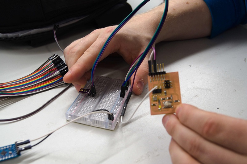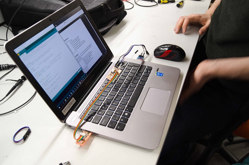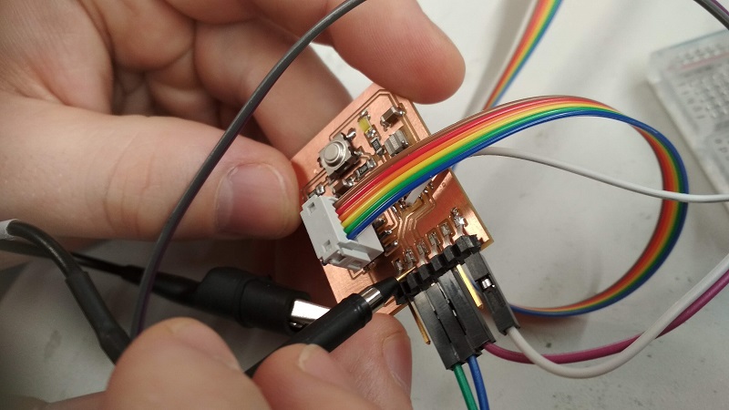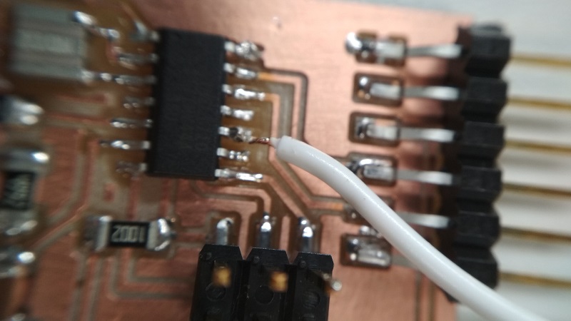 As said before our plan was to use ATTiny. Using Arduino IDE, we create a code, which was turning LED on every time photoresistor was lacking light. Our preiously designed board didn't have pinheaders to connect with output boards, because of that we simply soldered signal line to unused port.