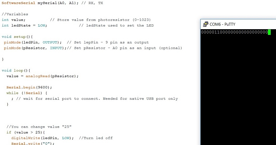 We have improved Arduino code, every time there will be no light detected "0" will be send, where any voltage (create by light) above given threshold will send "1" over serial port. This would be easily readable using putty. After couple attempts we achieved it.