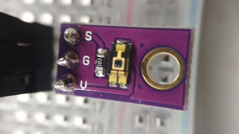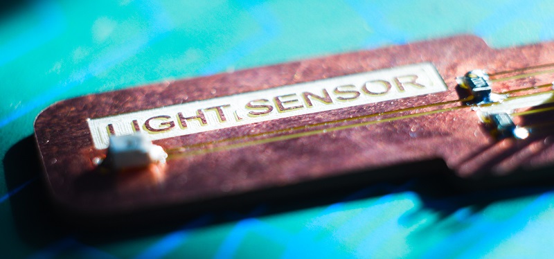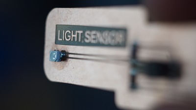 We managed this part quite well. We decided to work with ATTiny from now on. We have found photoresistor, element, which changes its resistance in presence of light. Our unit was nice, already embedded on the PCB. Circuit was simple - voltage divider. Value of first resistor is fixed, where photoresistor resistance varies. Voltage across photoresistor will change depending on light strength. There are three pins, which needs to be connected. Power line (TTL logic values), ground and signal pin - output value.