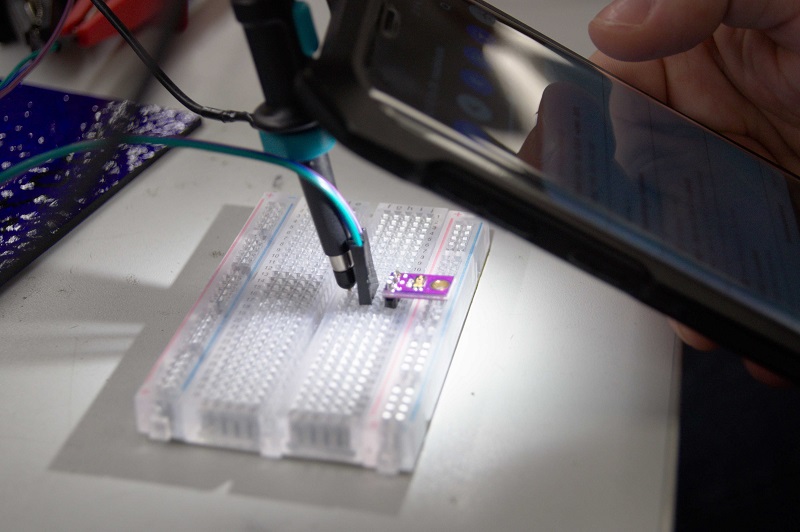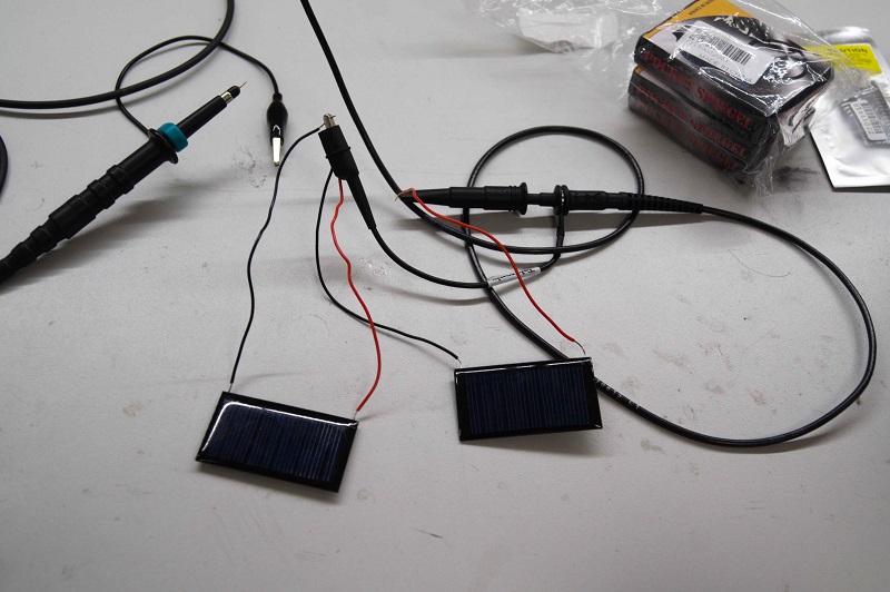 We decided to start with measuring signals from analog input devices. We have found couple photovoltaic modules. Those were rather small size compared to solar panels, which might be found on the roof. Nevertheless, we managed to obtain some decent voltage levels. We tried the differences between fluorescent lamp and Smartphone LED.