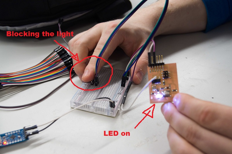 During this week I had some problems with my programmer (I made a new one later) so I asked my frind Lukasz for help. Using Arduiono we made a simple program which turns on the LED constantly if there's light detected and blinks it when there's no light. Later we changet it to turn off the LED when there's no light and removed the delay for easyer demonstration. The sensor is connected to ATTINY PA3(10) and the LED to PA2(11).