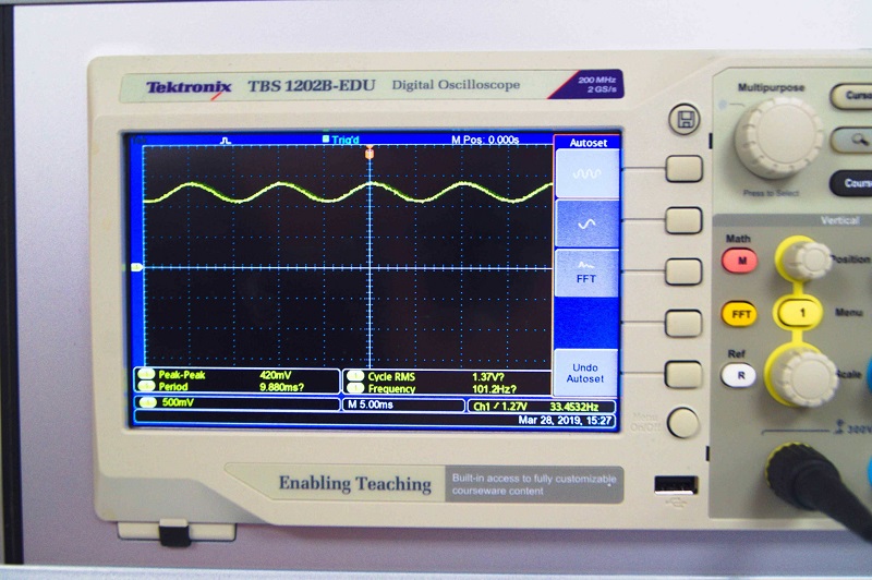 Our test unites were connected in series in order to obtain higher voltage values. We were using oscilloscope to measure output. We could have used multimeter with the same success.