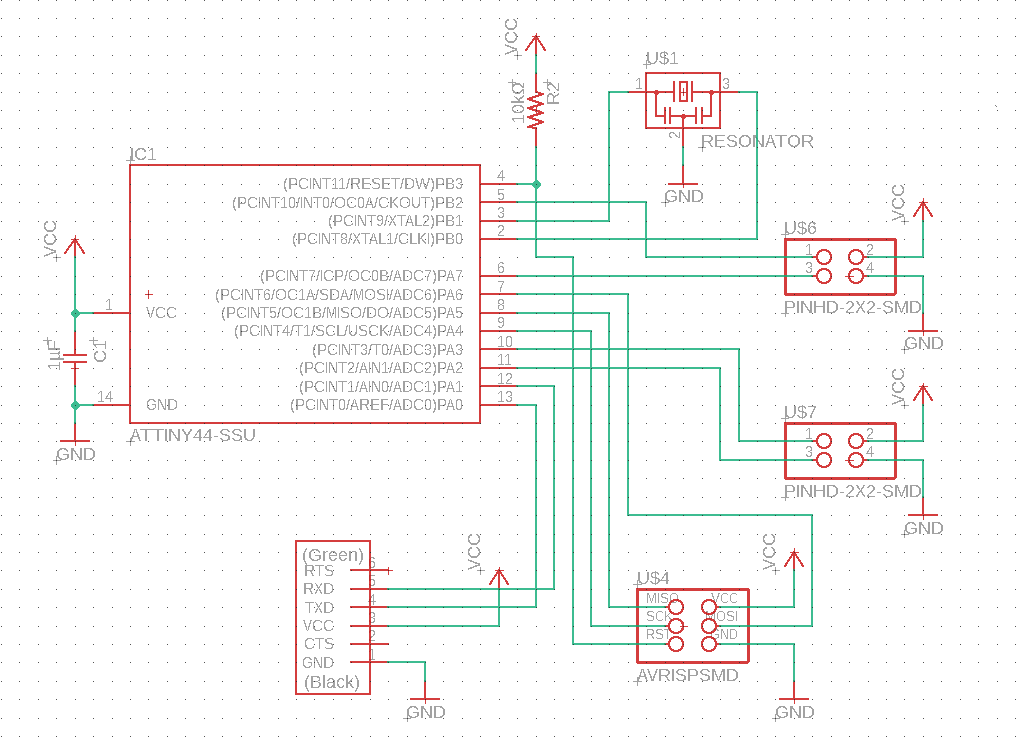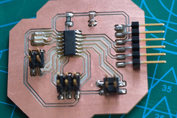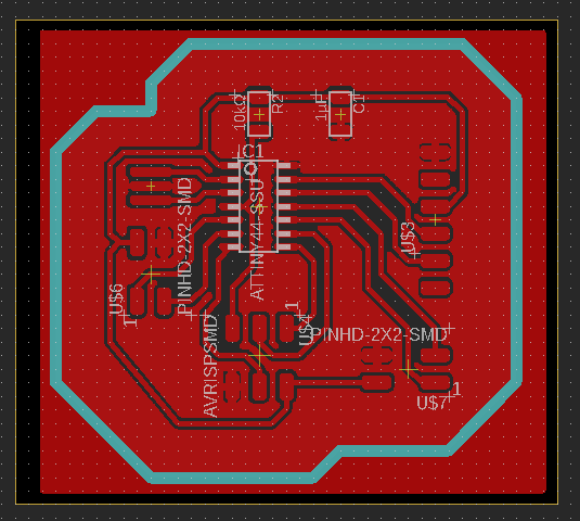 For this week I modified my Hello World board from week 7. I ripped off button and LED from the board and add 2 2x2 pin headers to be able to reprogramm it and reuse in the future. I like the way it looks like now.