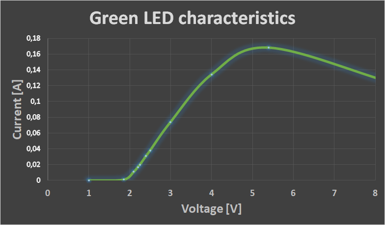 There are no more obvious choice as Light emitting diodes. Results are visible with bare eye and connection is very simple. We have found some random green LED on burned board. Our decision was to measure forward voltage to current characteristics. From this power might be easily calculated as Power = Voltage x Current.