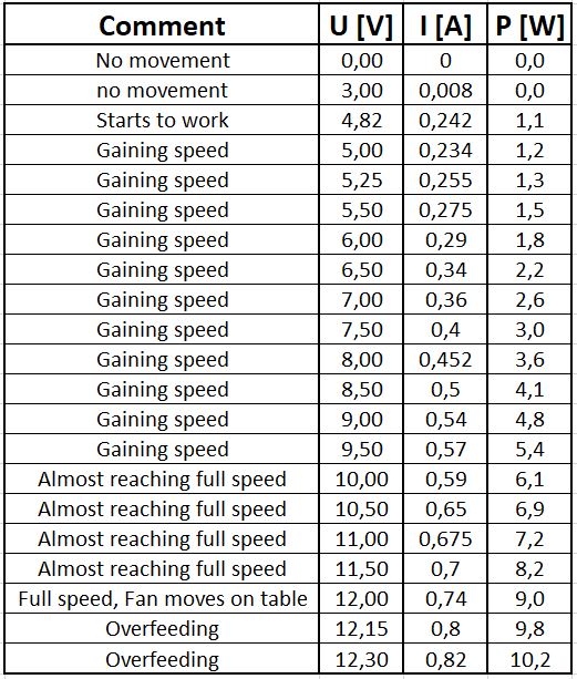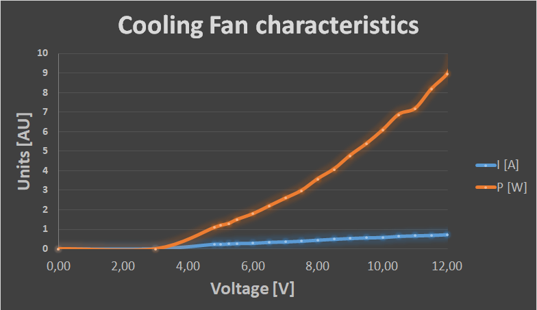 Our next choice was cooling fan. This was doing its best to cool down some electrical circuit. Nominal values were 12 Volts at 0.9 Ampere. This time we have shown some mercy and did not destroy measured element. Once again we used our laboratory power supply. This time we limited current to maximum value of 0.9 Amp and played with voltage. We managed to obtain both Current vs Voltage and Power vs Voltage characteristics.