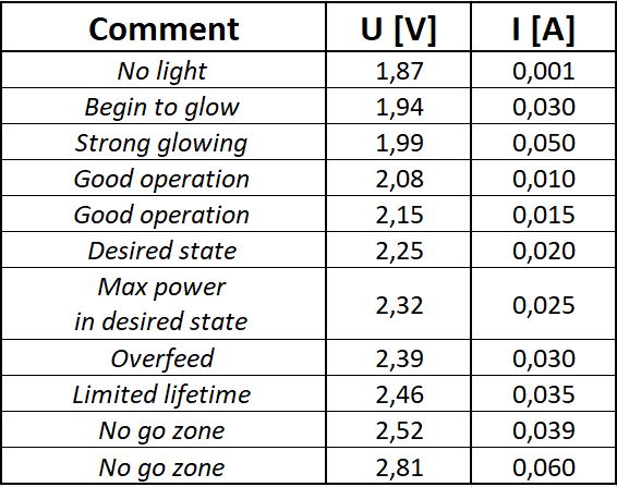 We were feeding LED with voltage, where our current was limited every time. We managed to obtain full characteristics from barely glowing to final breath of our LED. Results are shown below.