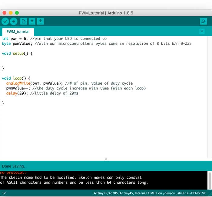 Example from the youtube video (in the links) about PWM [please click the link to check out the video of Code at work!]