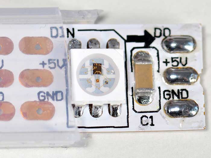 Compared to the normal RGB LED which needs 3 pins to control the Red Green and Blue value and all LEDs have to remain on or off, Neopixles can be controlled from a single pin on a microcontroller. This means one pin can control all of the LEDs colors and which LEDs are on or off at any given time.