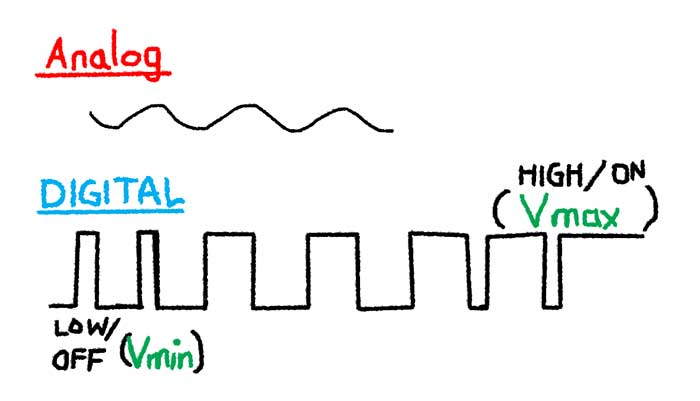 by effectively chopping it up into discrete parts going back and forth between minimum voltage, and maximum voltage.