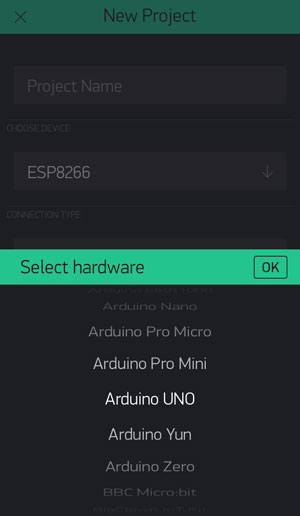 Once you log on, you can start your App building.You can set the Hardware and Connection setting and Create project