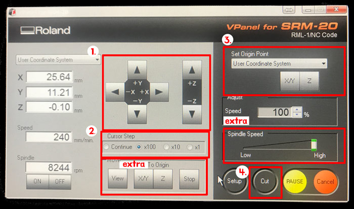 Extra. If you haven't used your machine for a while, you might want to warm it up by checking the 'Spindle Speed'