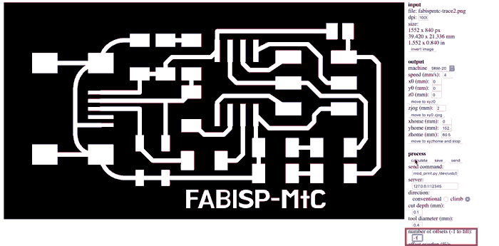 Under the Process section, don't change anything but the number of offset. Set howmany ever you want, but -1 to cut all the way to the edge. You can check your traces by clicking the 'calculate' button before saving. Click 'Save' and have it on the computer connected to your machine.