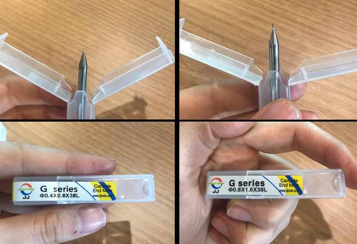 The end mills we will use this week are the 0.4mm (1/64") mill for tracing and 0.8mm (1/32") mill for cutting.