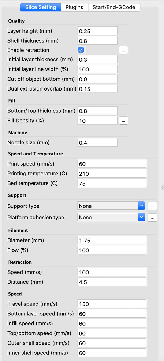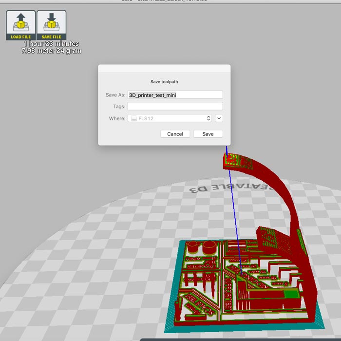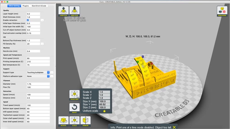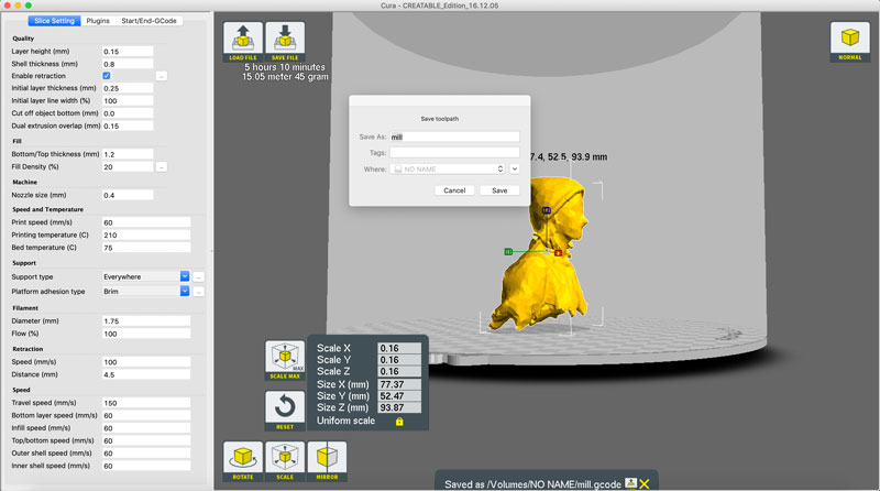 and loaded it up on CURA by clicking the load file on the interface, or opening by dragging the file. once loaded, it will show you how long the print will take as well as the length of the filament needed.