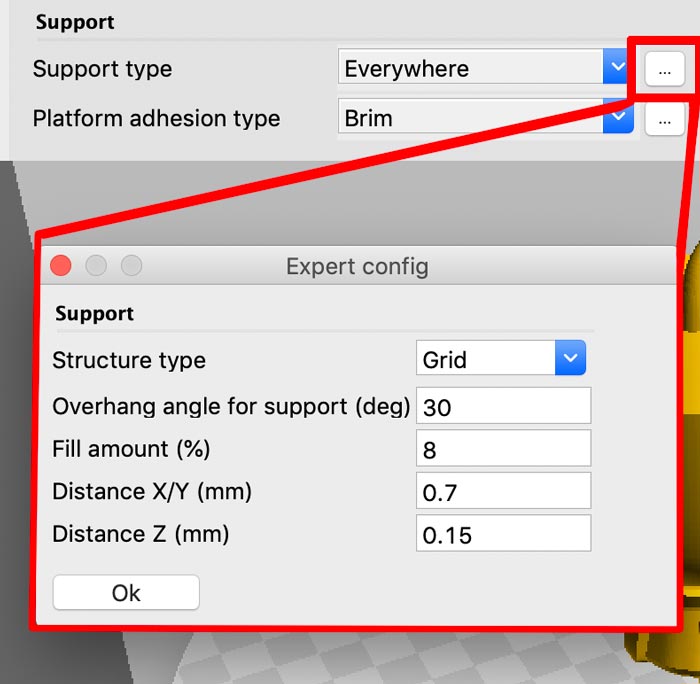 This one is only if you need them. For the Sample print, I didn't need one, but for some prints with big overhang or specific orientation, you need to have supports to make sure they come out. You can change the specification by clicking the three dot button on the side.