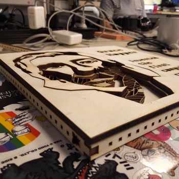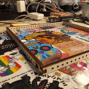 As I'm into Inkscape, I'll try on a frame to encapsulate everything, with a sentence to try and test a typography also. I'll go for a simple pressfit square of 20X20 cm. I went for it in the laser cutter pretty quickly. Here are the results of the process and once it is assembled :