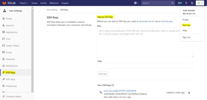 I have to find my SSH key and add it to my Gitlab account (that was previously made by the Fabacademy team, we received our login and password by email).
