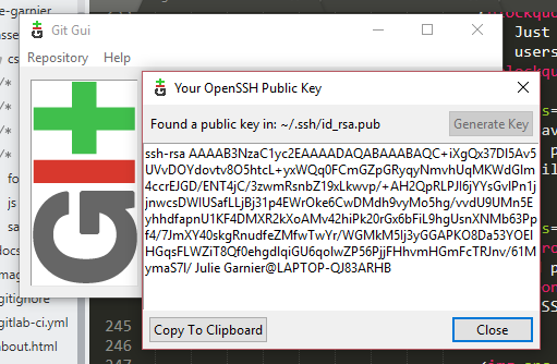 In order to find mine, I followed what my Fabacademy mate Madjid told me to do, and went on Git GUI. It comes to your computer when you install it on windows. Here the way to find it : open Git GUI > help > show SSH Key.