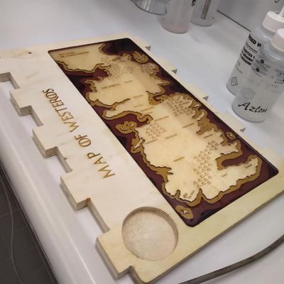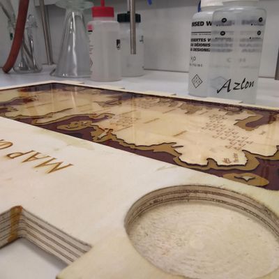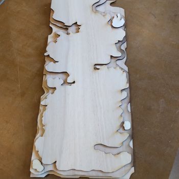 I wanted to drill the map directly in the main wooden plate, but I don’t have enough time so I’ll use the laser cutter to do the different layers for the map. And I’ll use some epoxy resine to put in it so the plate stays flat.