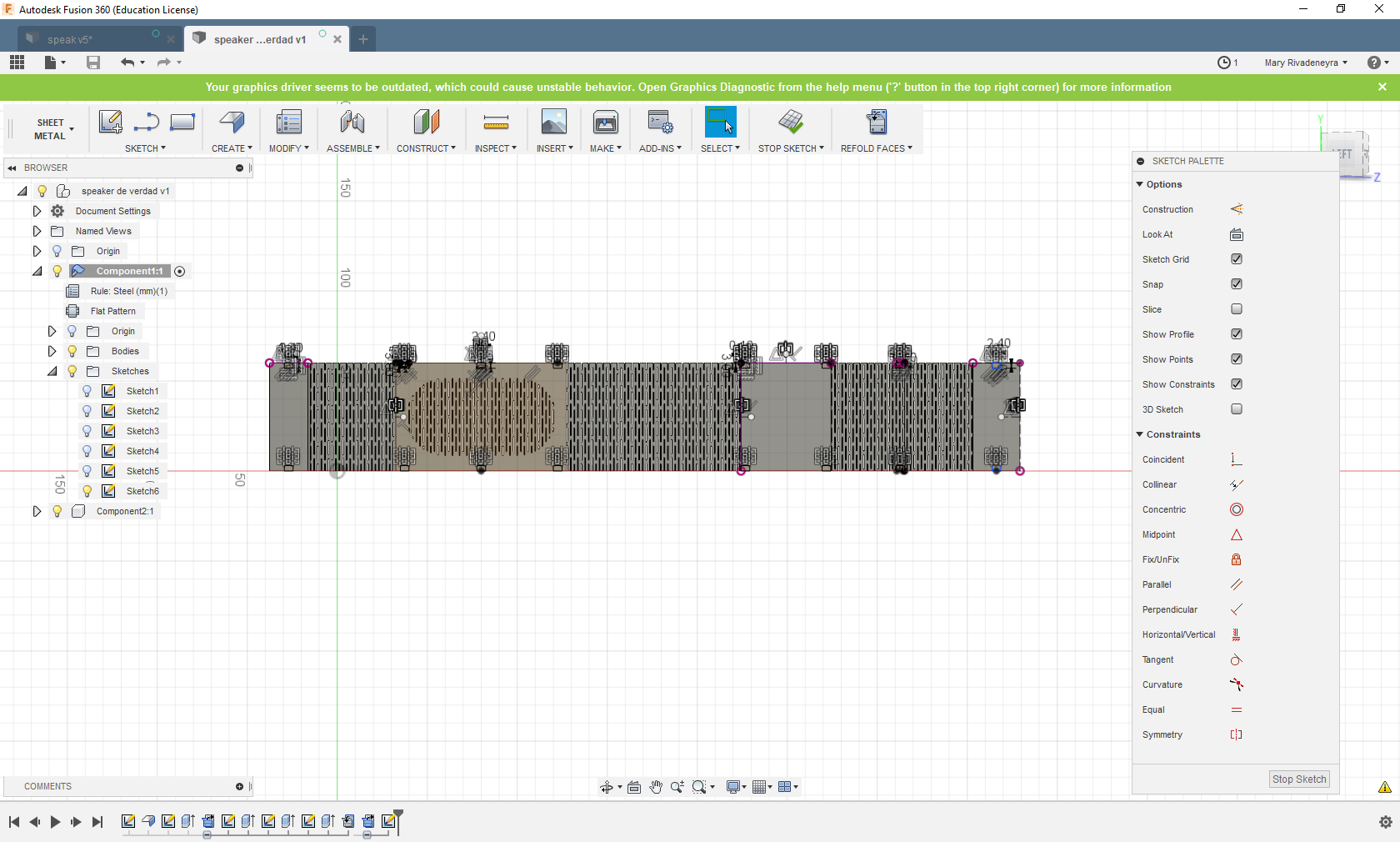 As you can see in the image below, there are some constraints that could be apply. In the case of changing for example the thickness of the material used, the size of the joints will need to be altered. I applied an equal constraint to the Y axis distance of each gap, this means from the sides to the center of the whole speaker. With this, if I change the size of one of them, the rest will change too.