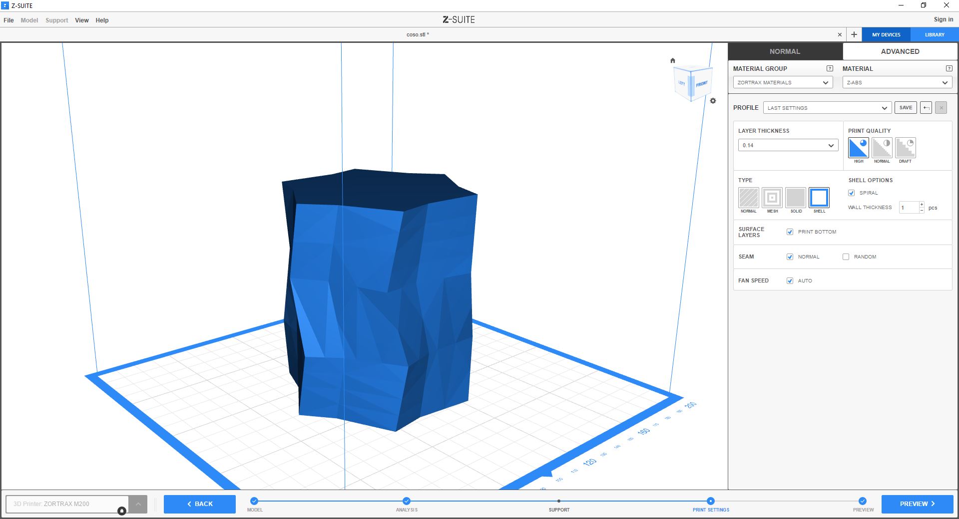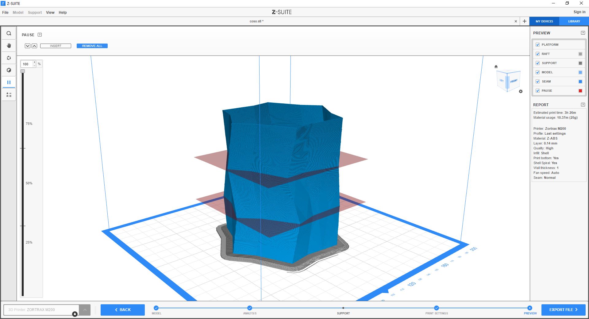 As in the previous exercise I used a Zortrax M200 Printer, and the Z-suite slicer. For more detail you can check Part I of this assignment.