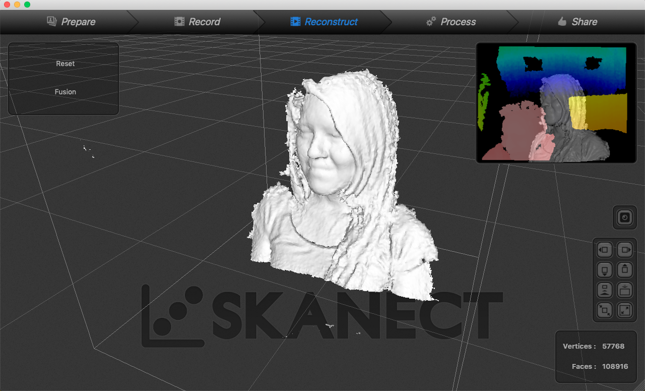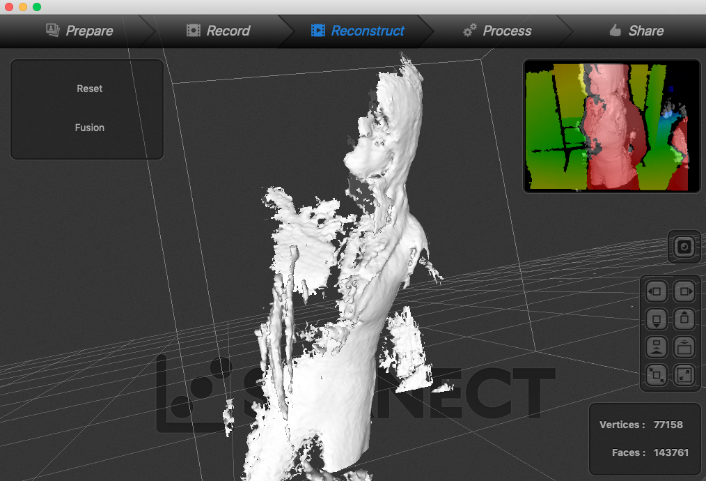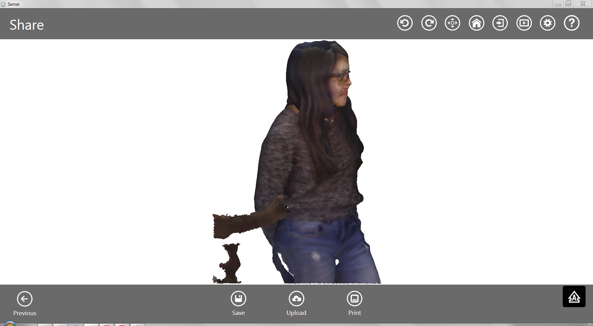 This time I started again with the Sense scanner and the rotating platform, but after a while this device worked better without it. The best way to do it was moving around what you want to scan, very carefully. As the target was, once again, me, I got some helpers moving around me with the scanner and the with the laptop to which it was connected.