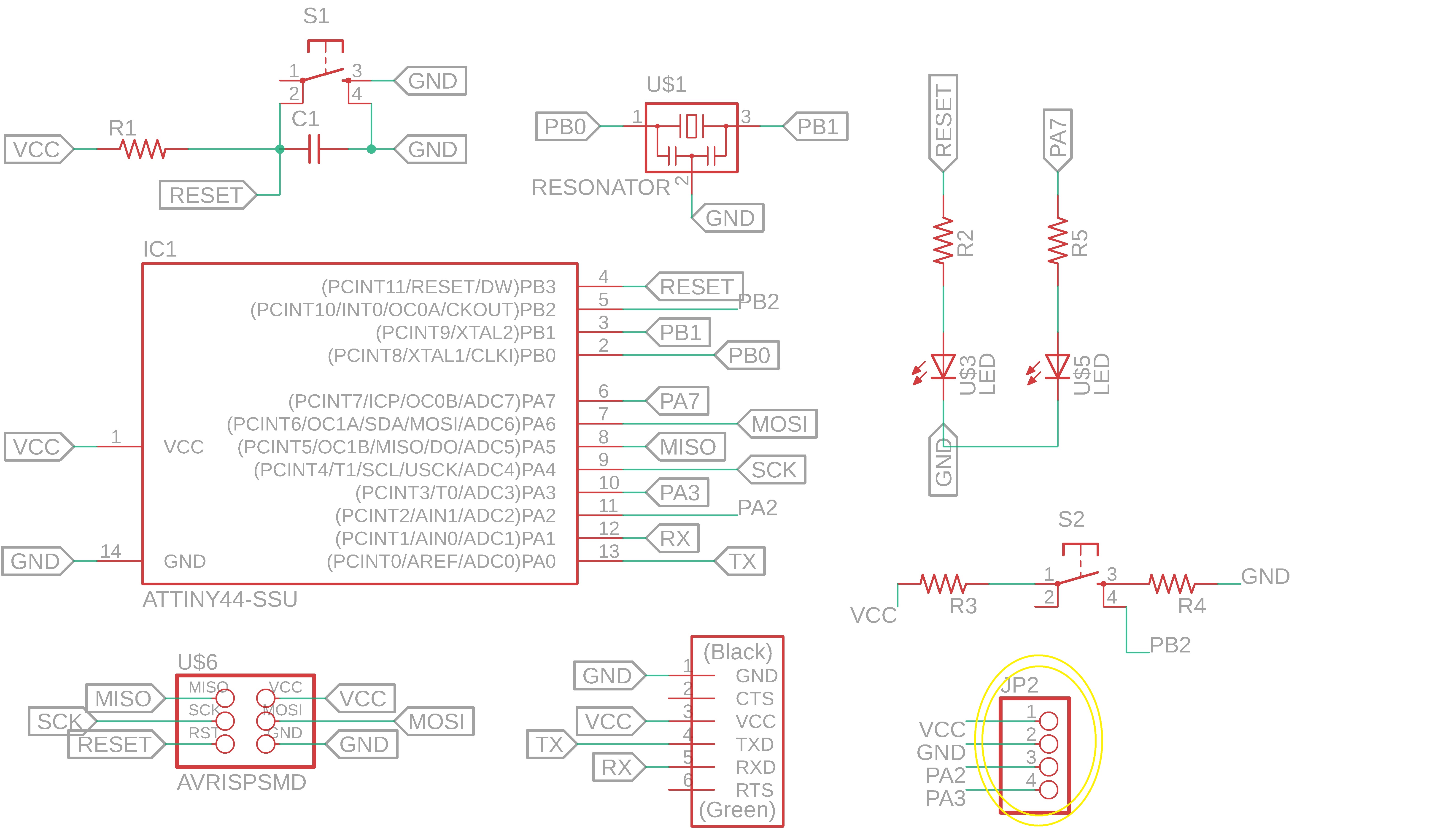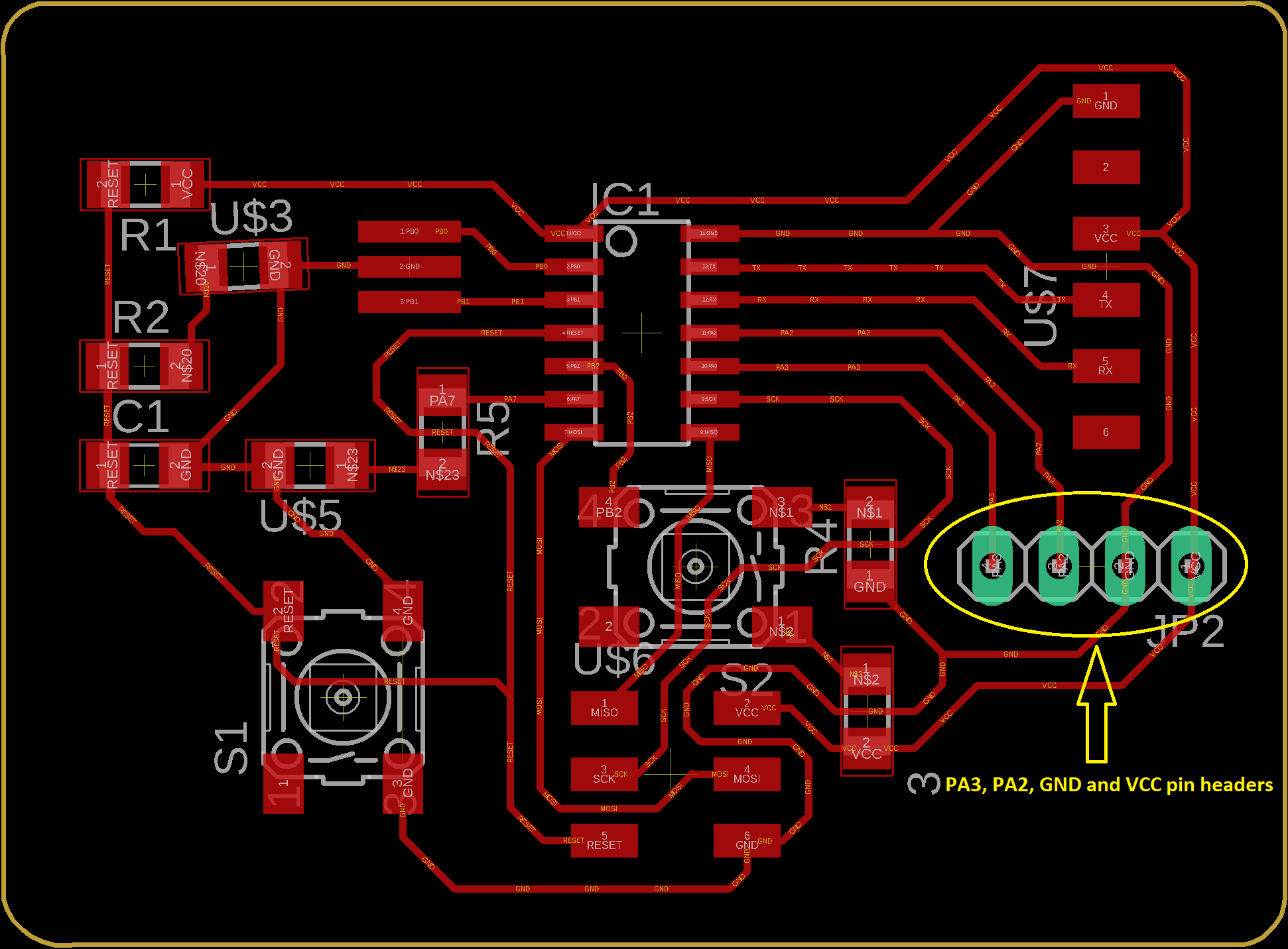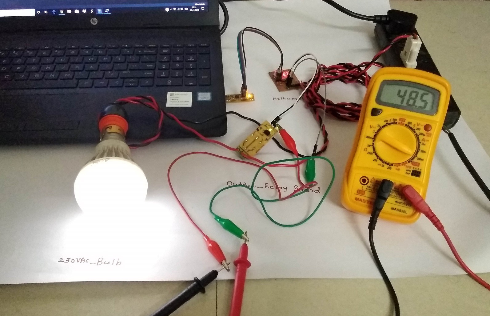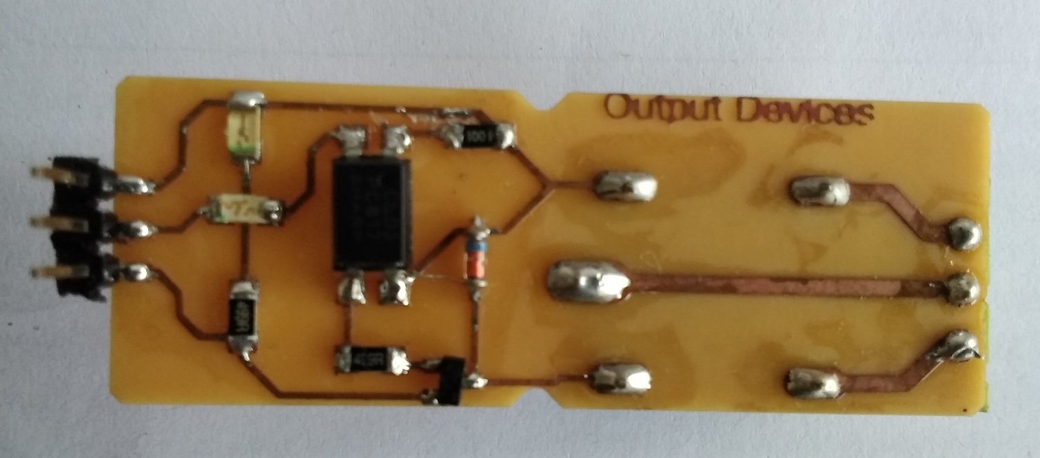 I used my helloworld board for this week i.e.'Output Devices'. I had already added 4-pin male header(PA3, PA2, VCC and GND) and the digital pin 'PA2' of Attiny 44 uC is connected to the relay board input pin as shown in above image.