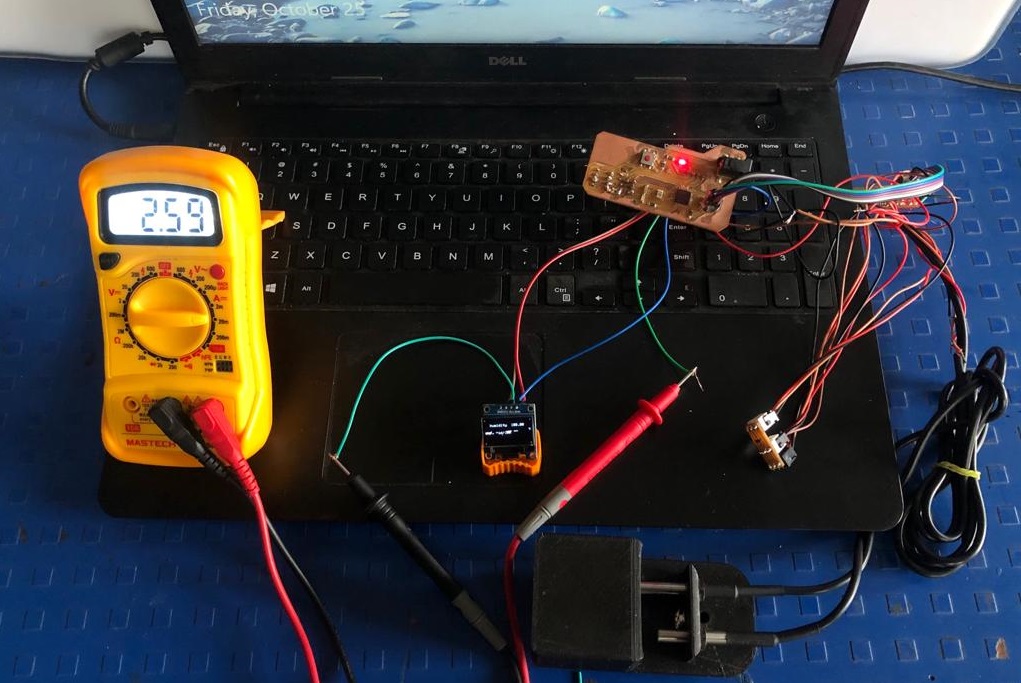 The OLED displayed temperature and humidity data. Of the 4 pins GND, VCC, SCL and SDA the multimeter was connected inbetween the VCC wire connection. The current from source passed through multimeter and reached OLED. Here, the multimeter displayed the value of current 2.59 milli Ampere.