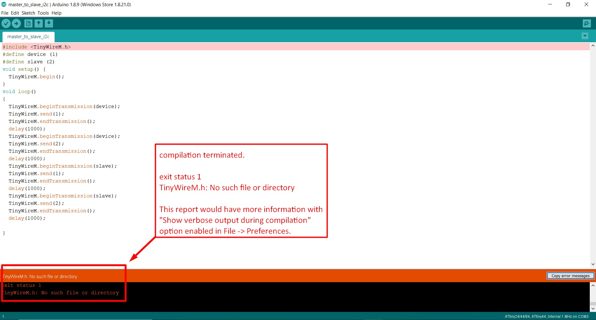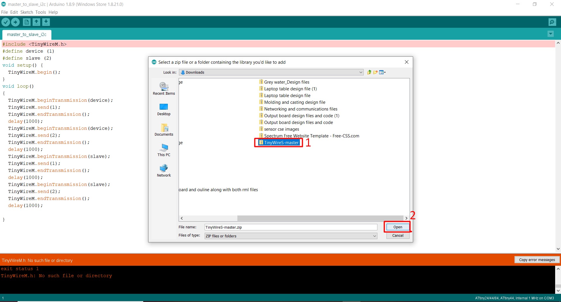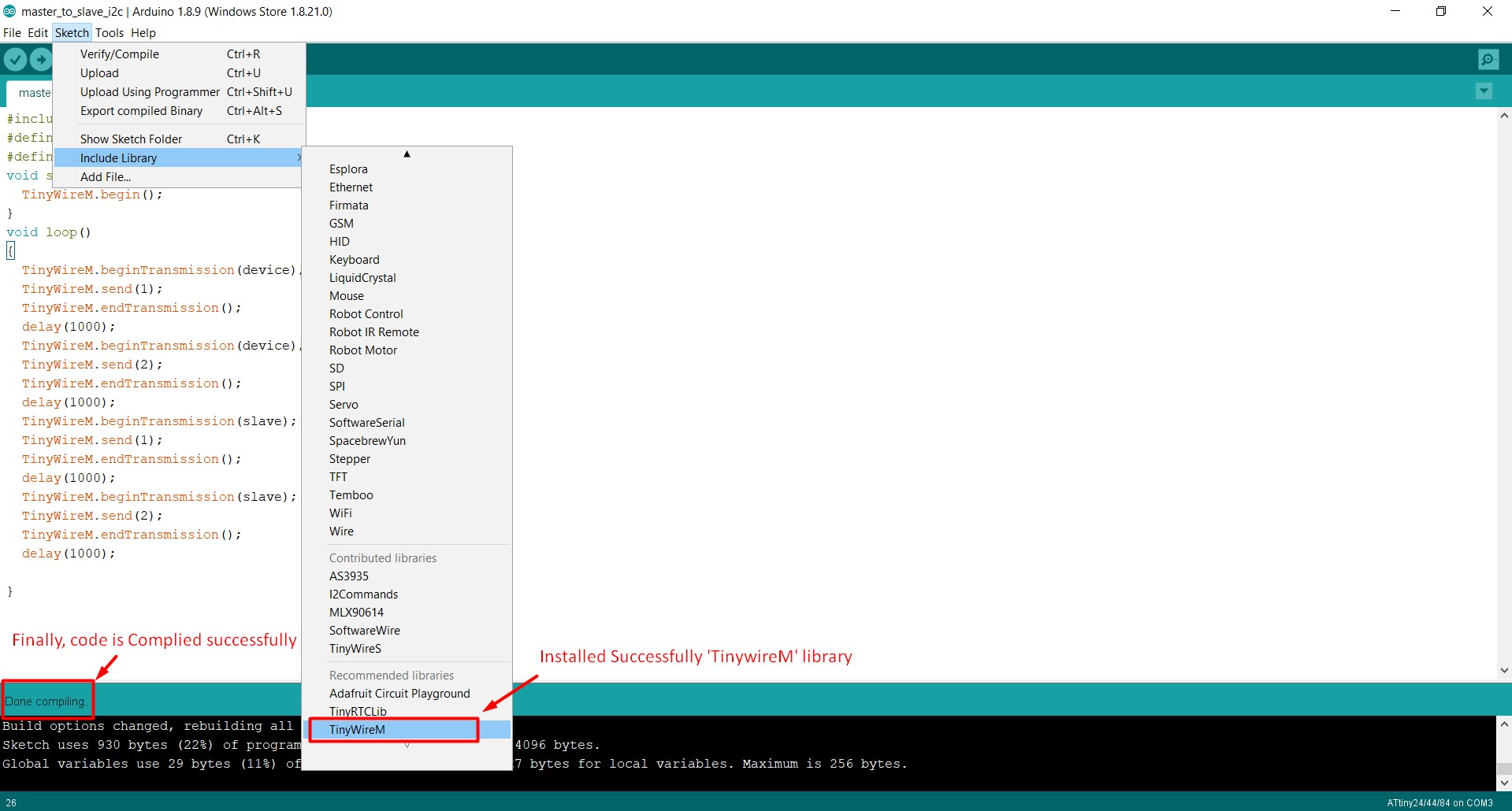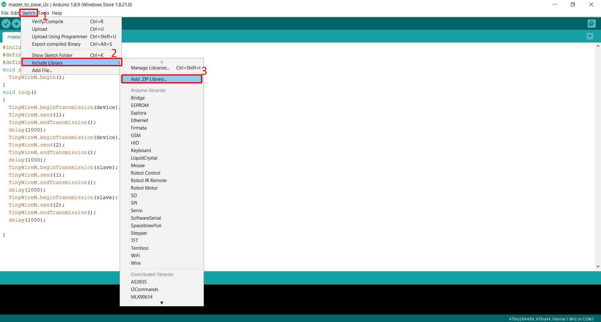So, I have to download a 'TinywireM' library for I2C communication. I downloaded this library from githum.com and I also attached link here, so you can download 'TinywireM' library