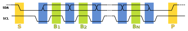 In normal state both lines (SCL and SDA) are high. The communication is initiated by the master device. It generates the Start condition (S) followed by the address of the slave device (B1). If the bit 0 of the address byte was set to 0 the master device will write to the slave device (B2). Otherwise, the next byte will be read from the slave device. Once all bytes are read or written (Bn) the master device generates Stop condition (P). This signals to other devices on the bus that the communication has ended and another device may use the bus.