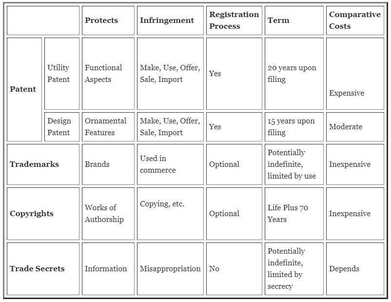 Protection by each Intellectual Property: The table below illustrates each of the four different types of intellectual properties and what they might be used to protect in a broader sense.