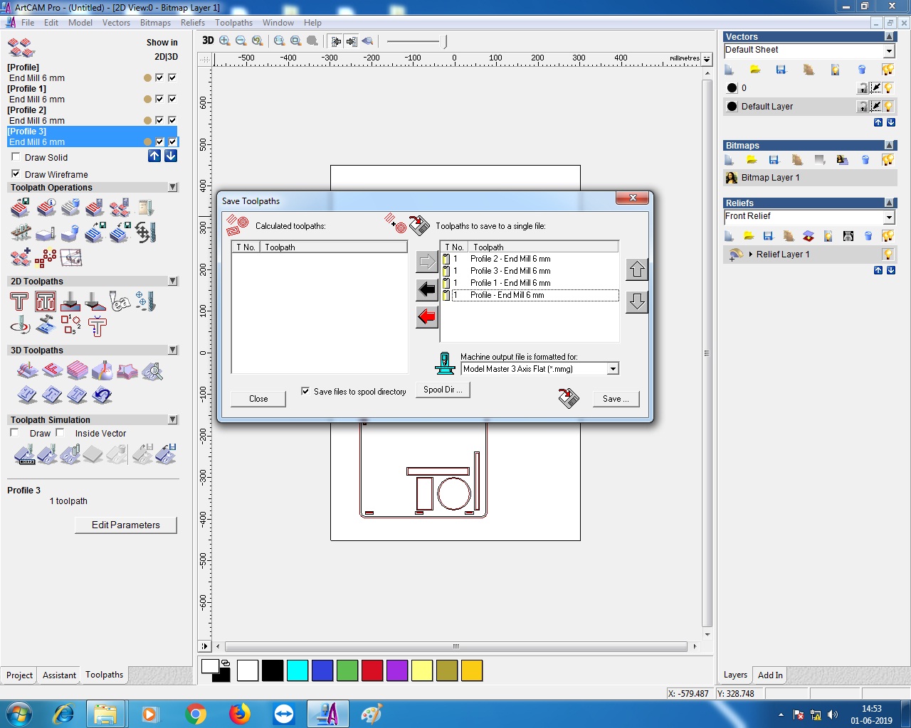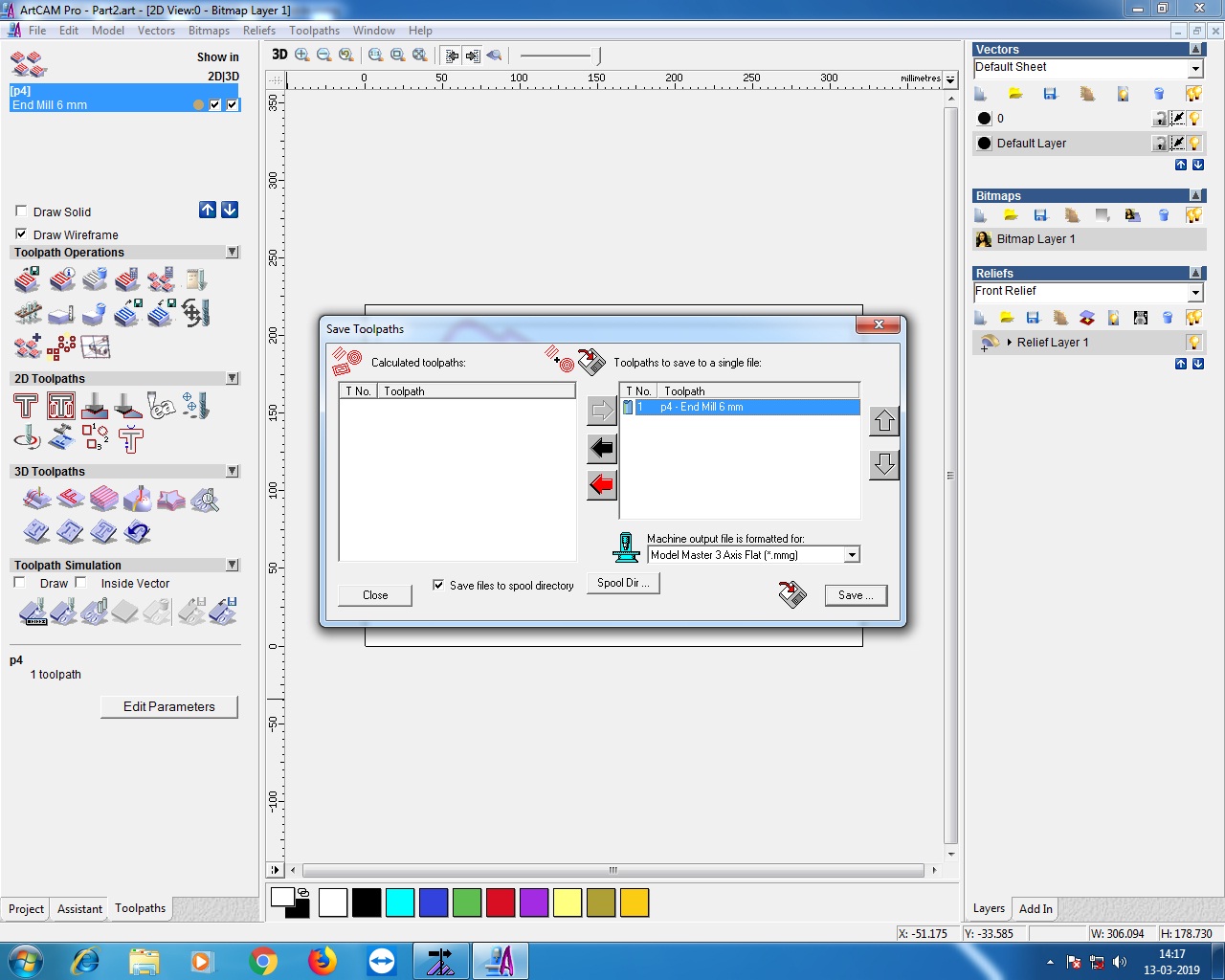For milling I need to make 'G-code" (Toolpath) file from the '.DXF' my design file. There is a "Art Cam Pro" software for making 'G-code' file form '.DXF' file.