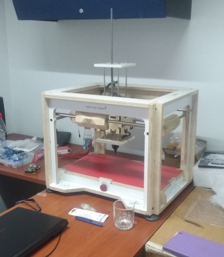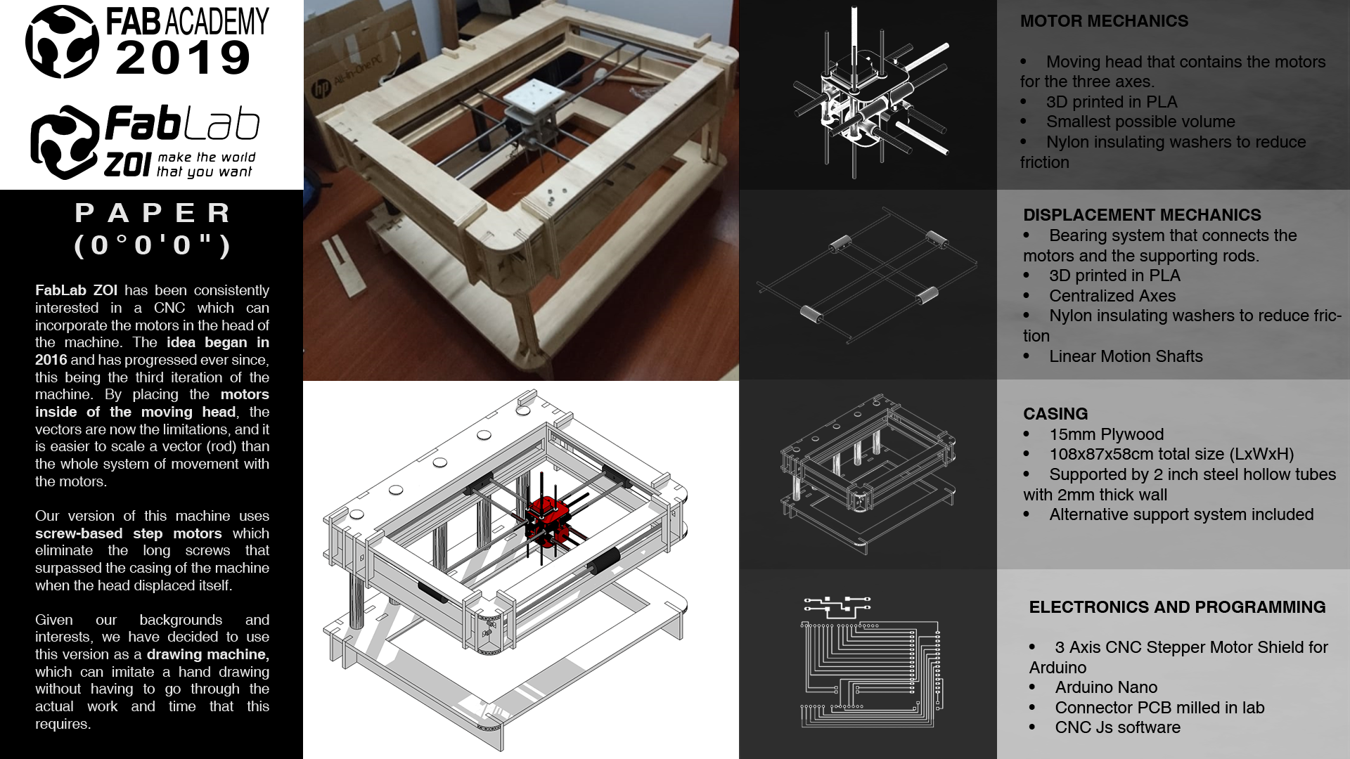 In the year 2017, the first 0 CNC was created as the machine week project in FabAcademy by the students of FabLab Yachay. This machine had the motors in the moving head and worked via a system of rods that was easily transportable and could be assembled quickly.