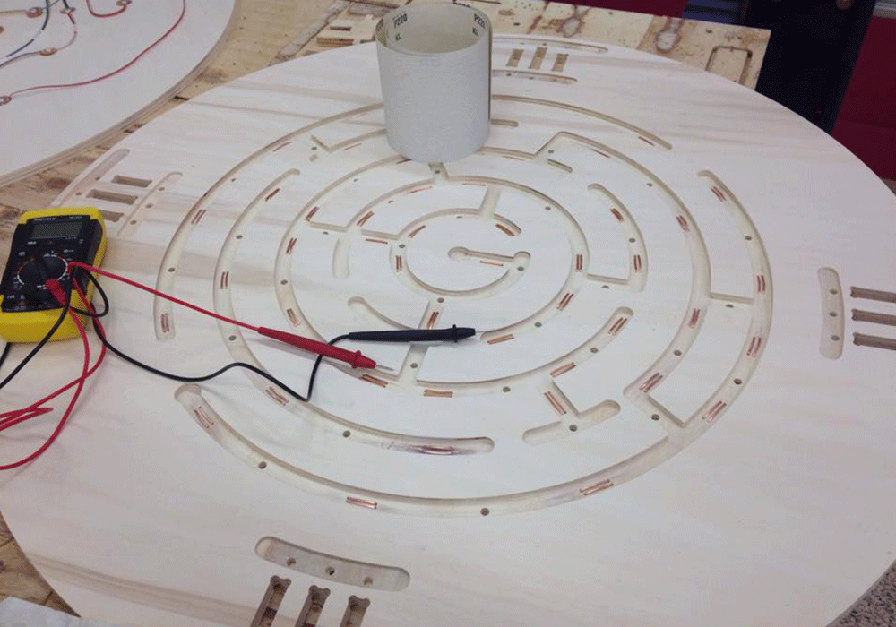 - The switches don't detect the marble unless I press slightly on them. For the next version I'll have to carve the copper into the wood and find heavier bearings.