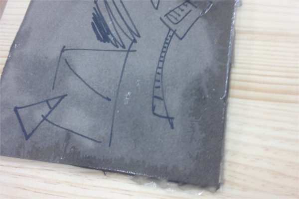 I started by asking around for the material data sheet for the bio-resin. No one had any instructions on how to go about using it, so I looked up the internet. I found out that I needed to mix two parts resin to one part hardener. As is the usual with epoxy resin it was expected that you mix the resin well. I was also interested in whether any surface markings (with pen) would work with the resin being applied.