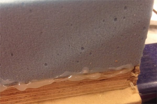 I had to stick together two pieces of blue foam to make a shape big enough to fill my mold shape. I used Gorilla glue, an expanding glue that reacts with moisture. Because blue foam doesnt have any internal moisture I had to apply some with a wet towel before applying the glue. I also clamped the blue foam together to make sure the expanding glue didnt push the pieces of foam apart.