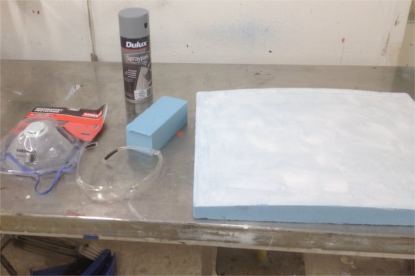 I now needed to prime the block so that nothing would stick to the top surface of the block. I used an enamel based sanding primer I boought from a building supplier called Bunnings. I sprayed a test piece of greenfoam with the primer to see if it would react. It didnt, so I moved onto spraying the block.