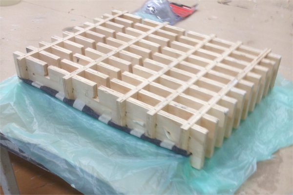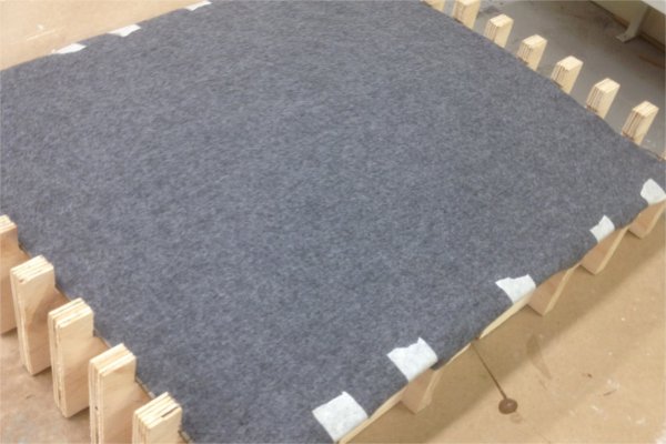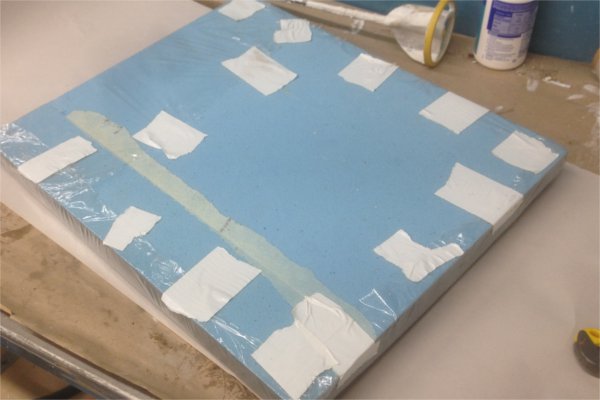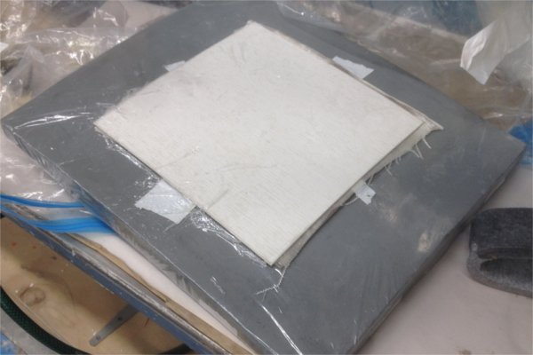 To prepare my press I laid wool fabric over the cardboard skin of the press. This was to help with the pressure of the two part press, but also to reduce the effect of the staples which hold the matboard skin to the torsion box. I then laid sheets of plastic bag over the press to make sure the hydrostone composite did not stick to the press.