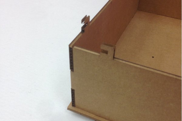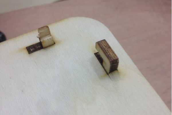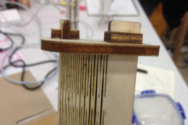I moved on to (supposedly) 4 mm poplar plywood (which turned out to be between 4.5mm and 4.8mm). After 3 of 4 tests to figure out the tolerances of our laser cutter (which was about 0.1 per line cut for poplar ply) I had a test joint that fit nicely.