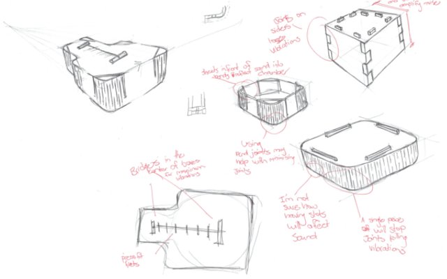 I started to draw. I looked at how the box could fit together and resonate nicely, as well as provide enough support to hold the tension of the string. I came up with a concept that used two resonating plates (front and back) with a single divider piece (which split into two due to material size limitations). To make a single piece I was to use laser cut flexible bends, the joints were to have a locking mechanism using the nodes tutorial which I found before, and the string and bridge was to be supported with a mechanism I found in a laser cut ukulele. Finally I planned to parametrically make the joints to allow for easy customisation in future designs.