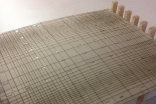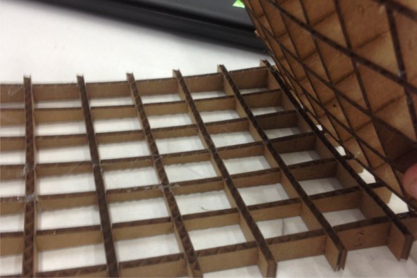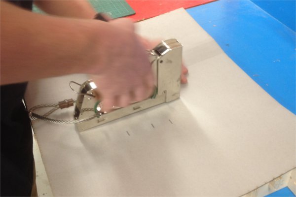 Finally it was time to skin the torsion box in the laser cut matboard. The matboard bent well because of the lasercut lines. This also meant that the material was very fragile. Geoff and I attempted to attach it to the torsion box with staples which worked somewhat. It is worth noting that Wendy reccomended that we start in the middle and staple outward, which we did. This worked well and helped us avoid errors.