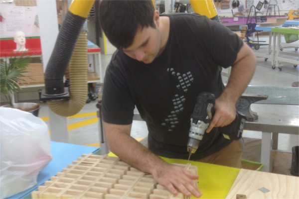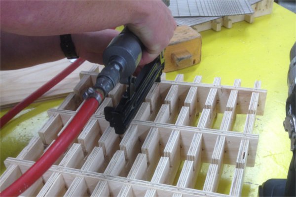 the first press I assembled was pulling apart from the tension of it fitting together. This would effect how the front and back would look, so I needed to find a way of sticking the peices together. Fab academy Geoff helped me in deciding to drill pilot holes and nail gun the torsion box together.