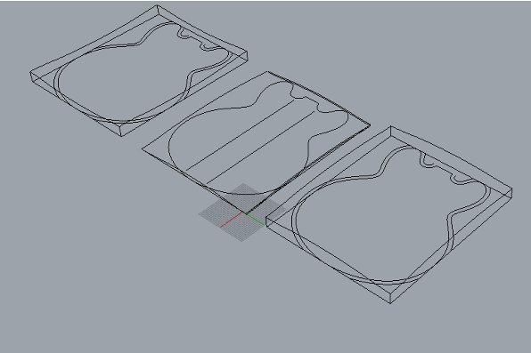 As you can see, the test worked well and fit nicely with my press. I had a question about how to attach my matboard skin to the final plywood press, and it was suggested that I use small nails. A good idea. It was getting closer to cutting, I just needed to finish my final file. because 123D make doesn’t work at the lab (something about the university firewall), I had to go home to remake the file in full scale. One thing I needed to add was a way of holding the press in the right location under pressure. It was suggested that It might be a good idea to use locator pins in the shape of the guitar face and cut the material to shape before hand. After testing this out in rhino and 123D make, it wasnt going to work.
