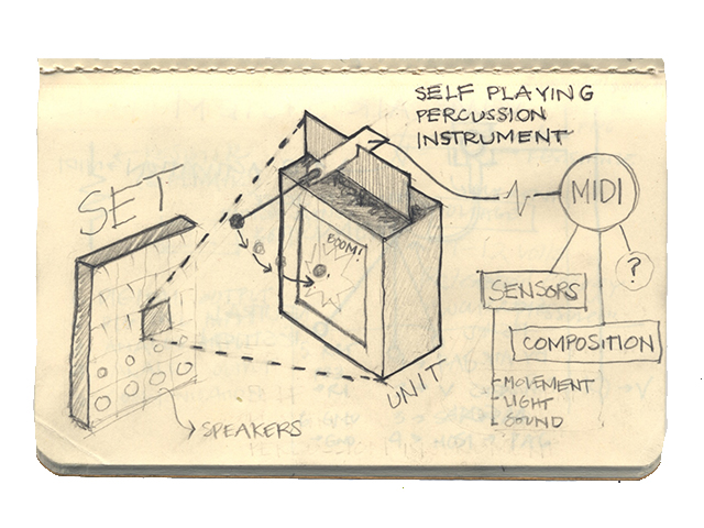 For this system to work I have to think on how to solve the "percussion" itself. That is, the force of -what- will make something esle (a stick) move to hit the surface being played. Some people solve it with a single motor to active every hit, some others solve it with gravity (check the marble video). I was thinking of using air, although I think this could be very complicated. I still did this diagram: