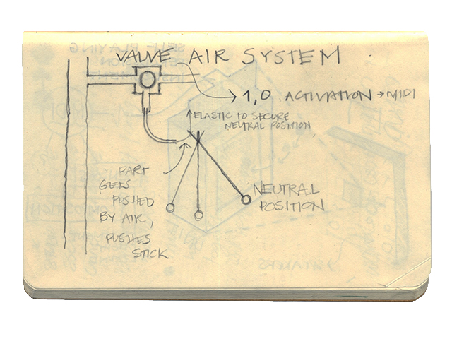 Air and valves that are controlled according to a midi instruction sheet. Every closing of the valve delivers an amount of air pressure to an activator...