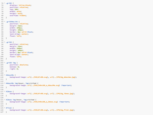 The CSS code then sets a number of graphic attributes for every tag, class and ID referenced in any file to looks for the specific stylesheet's graphic directions. You can see the full CSS file by clicking here. Note that when I want to refer to an ID, it has to be called with the hashtag. It is withing the CSS file that I defines what images were to be shown under the img:hover (read: mouse-over) action!