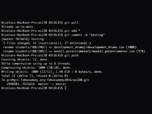 Once GIT was installed and configured, I could follow the sacred 4 steps to use GIT. That is, withing Terminal, the following actions: PULL, ADD, COMMIT, PUSH. These can be seen in the following image: