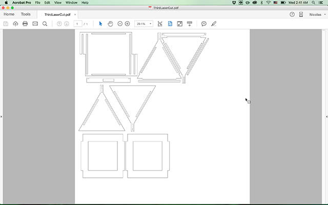 I used Inkscape to produce the necessary PDF files also because it has a clone function that can be arranged to work as a parametrical feature, especially with some thicknesses and explorations regarding the kerf product of the laser cut.